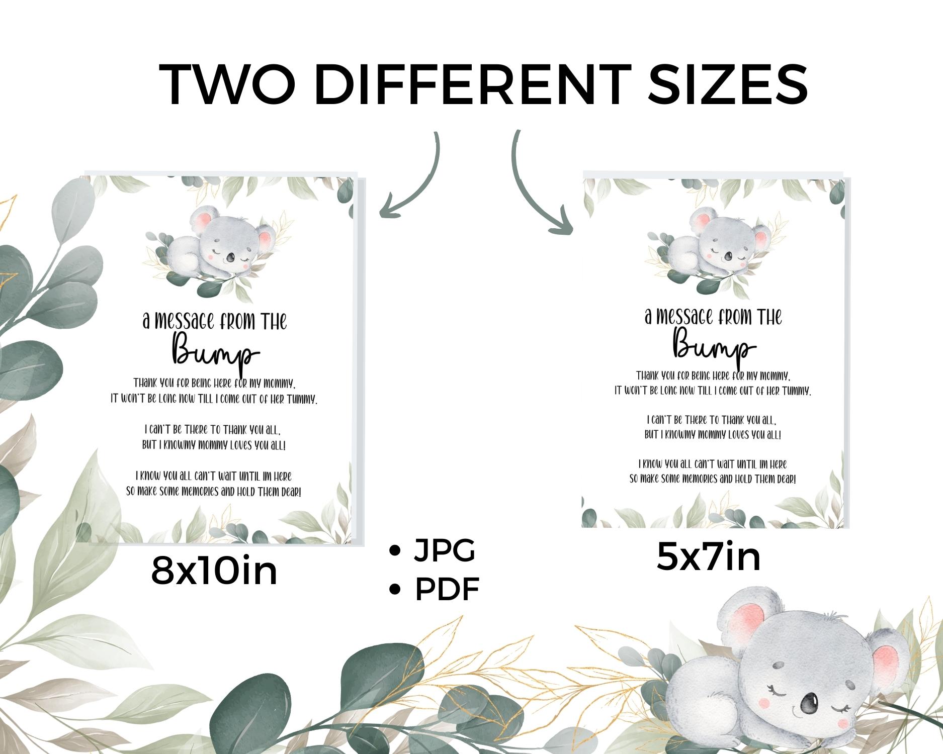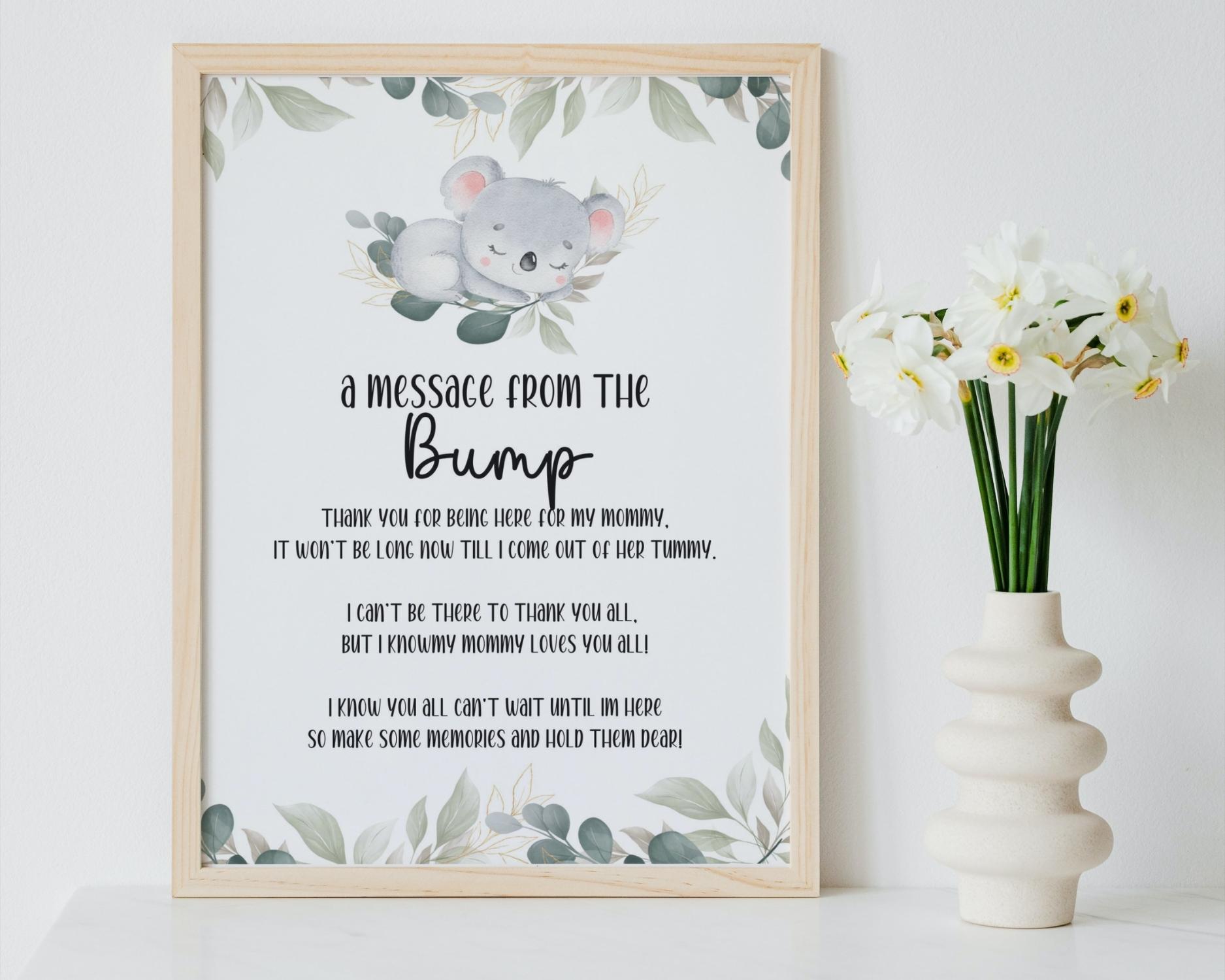 Elevate the sentimentality of your Koala-themed baby shower with our “A Message from the Bump” sign, designed to add a heartfelt touch to your celebration decor. This sign isn’t just a decorative piece; it’s a meaningful addition that captures the emotional journey of pregnancy.