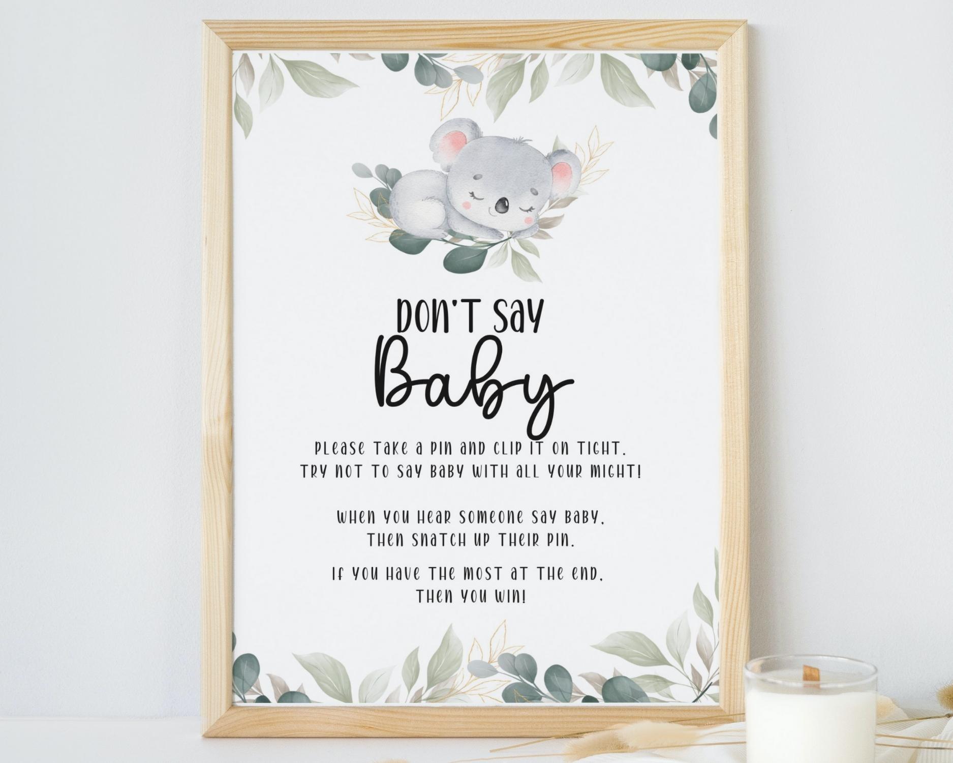 Elevate the fun and excitement of your Koala-themed baby shower with our engaging “Don’t Say Baby” Game Sign, designed to add a playful twist to your celebration decor. This sign isn’t just a decorative piece; it’s a lively activity that will have your guests laughing and bonding throughout the event.