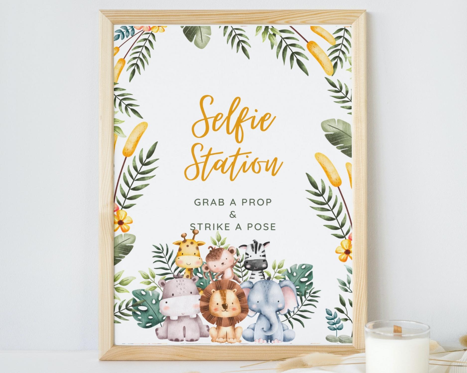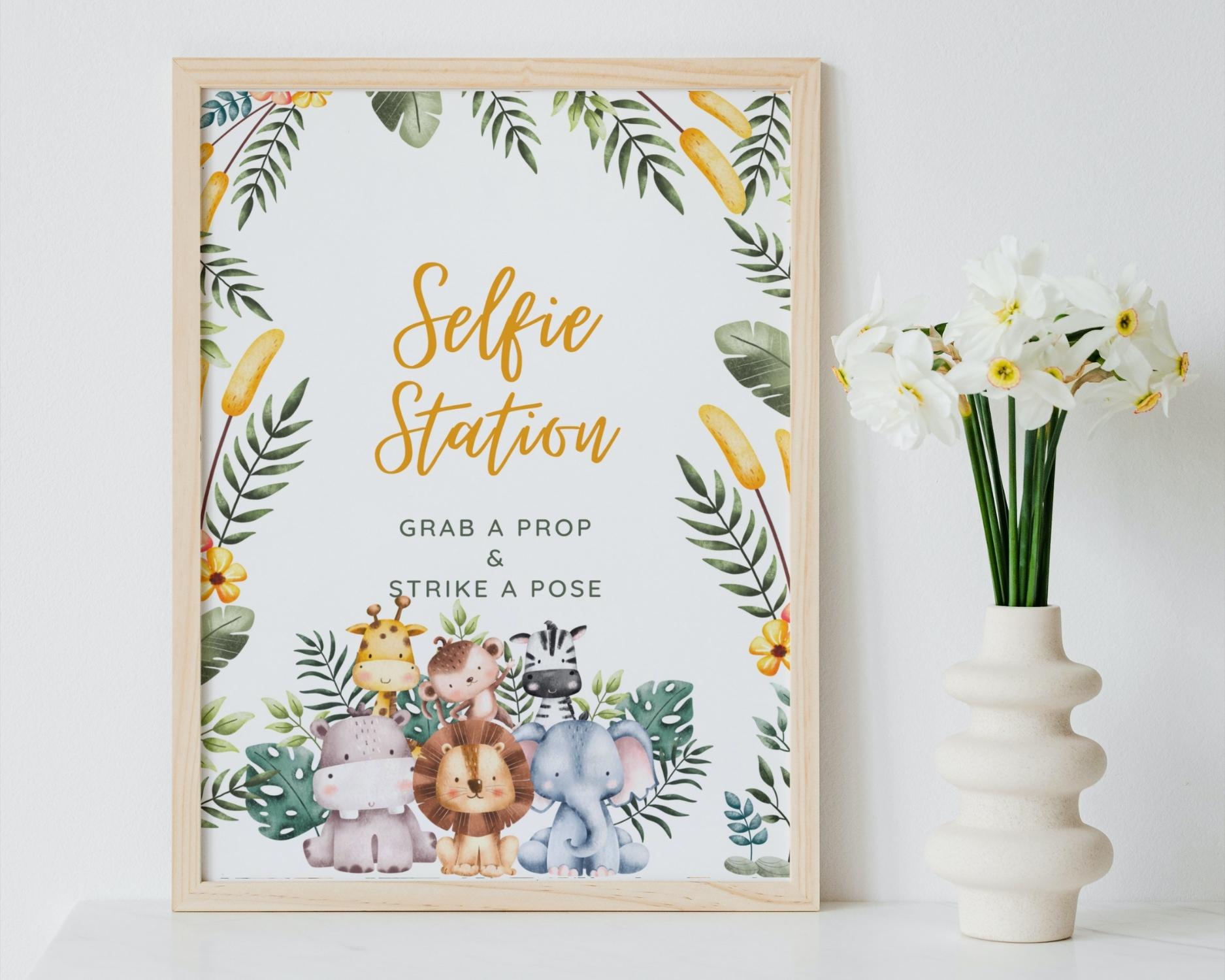 Selfie station table sign for baby shower party safari themed