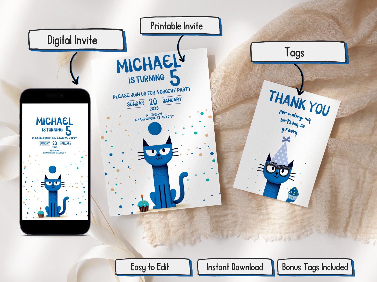 Welcome your guests to a groovy celebration with our Pete the Cat Invitation + Tags set, featuring the beloved children’s book character Pete the Cat. Perfect for adding a playful and colorful touch to your event decor.
