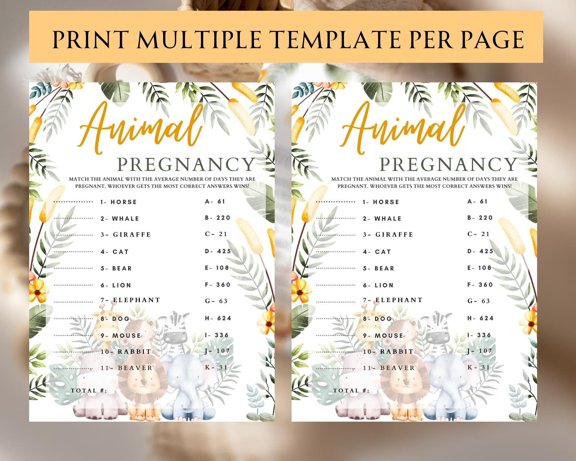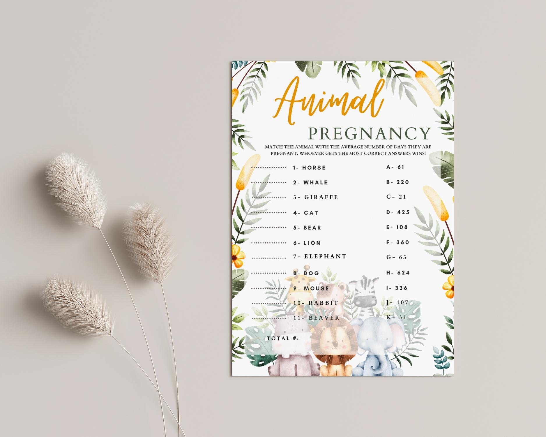 How long are animals pregnant? Find out with our ‘Animal Pregnancy Game’! This educational game compares human and animal gestation periods. It’s a fascinating way to learn and have fun at your safari-themed baby shower. Downloadable in multiple sizes with editable options.