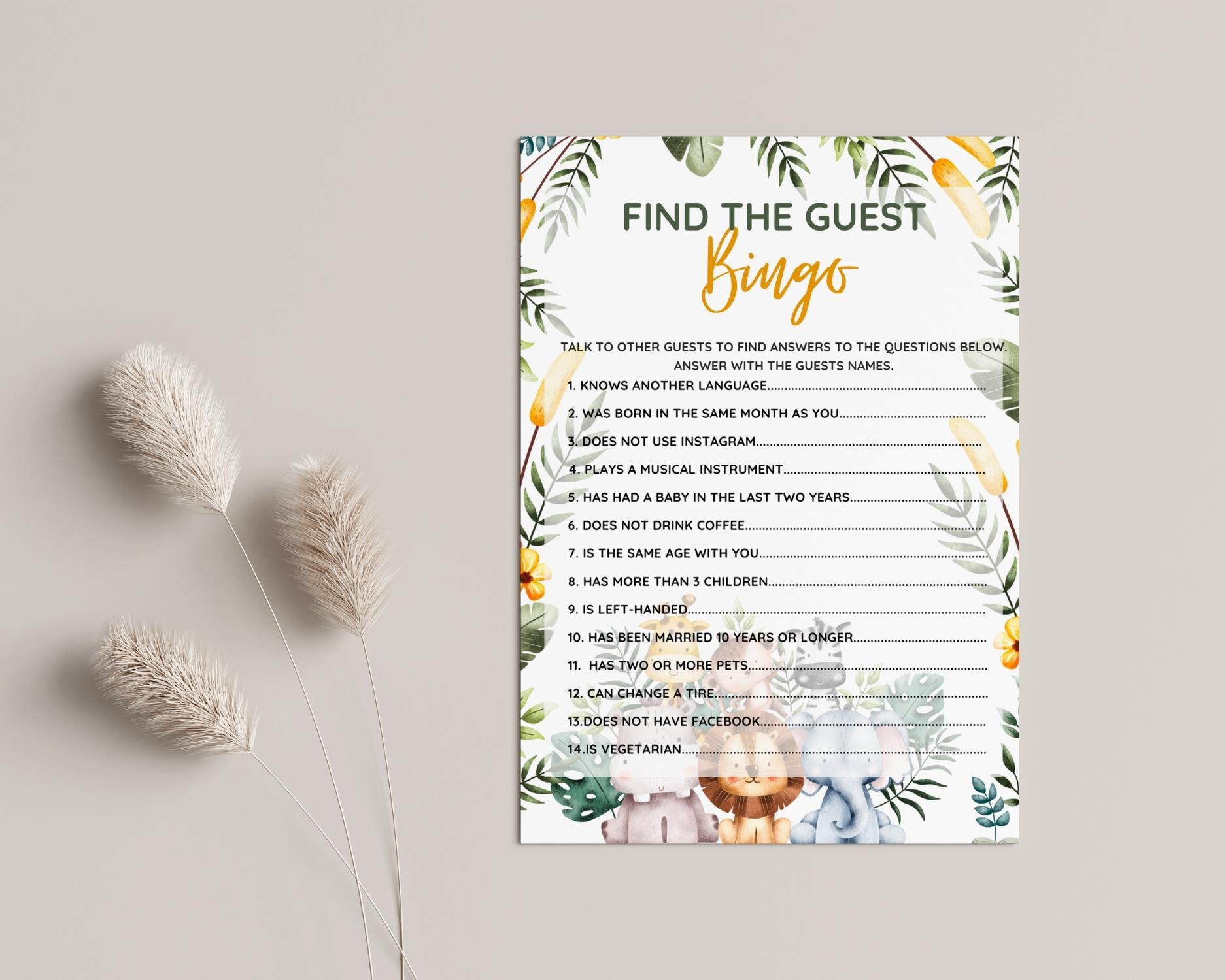 Safari Themed Find the Guest Bingo Game: Editable Canva Template & Printable PDFs for Baby Shower games