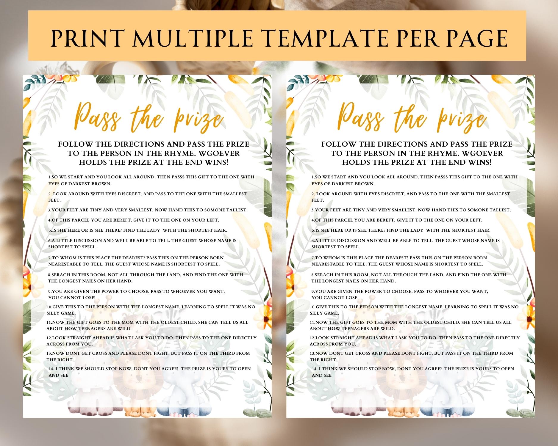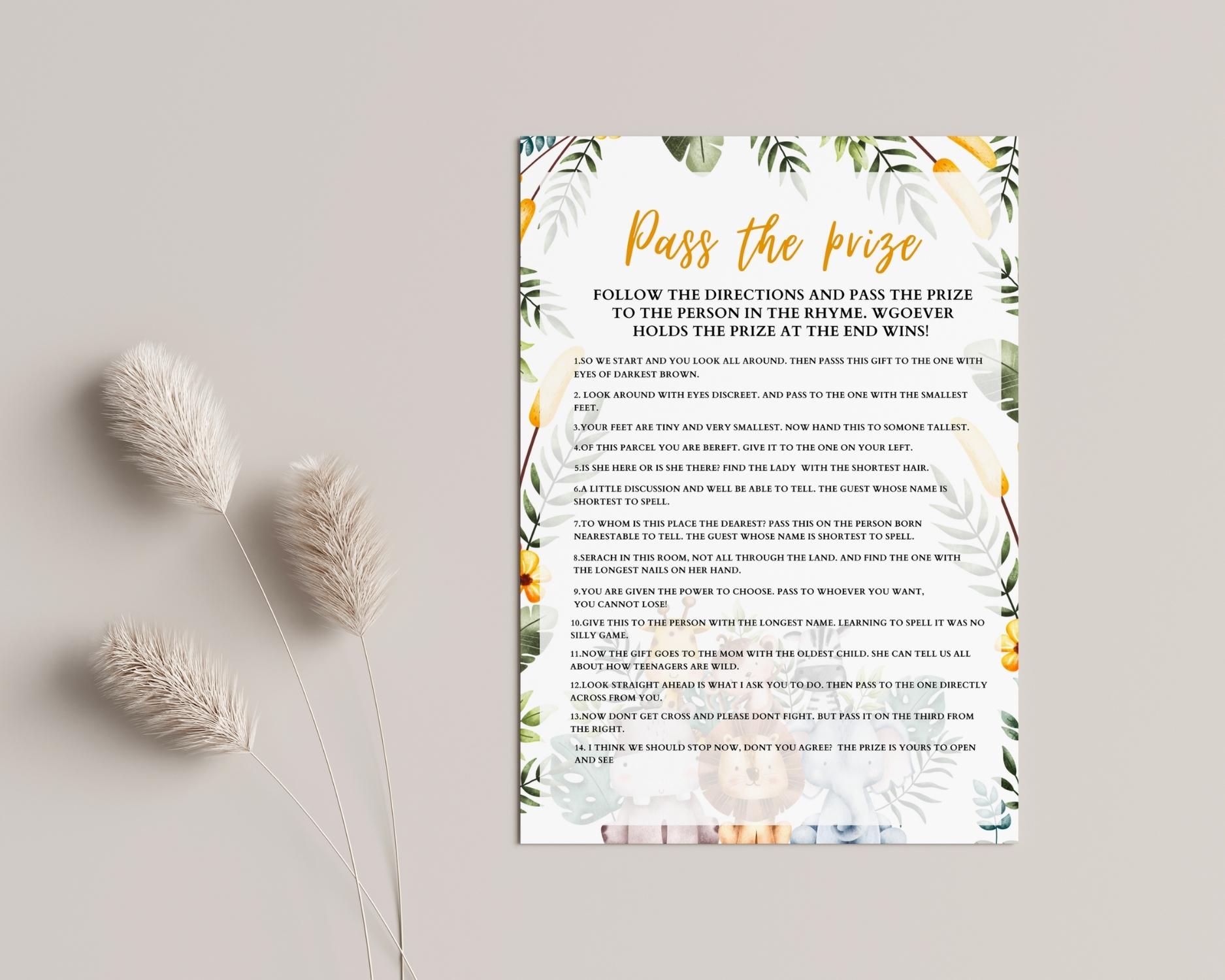 Attention, bargain hunters! Our safari-themed ‘Pass the Price’ game is all about guessing the cost of baby essentials. Guests will pass around a plush safari toy (like a cute lion or cheeky monkey), and whoever holds it when the timer stops must guess the price of an item (e.g., baby wipes, pacifiers). It’s a fun way to test your shopping skills! And yes, you’ll receive not one, but two PDF files and an editable Canva version.