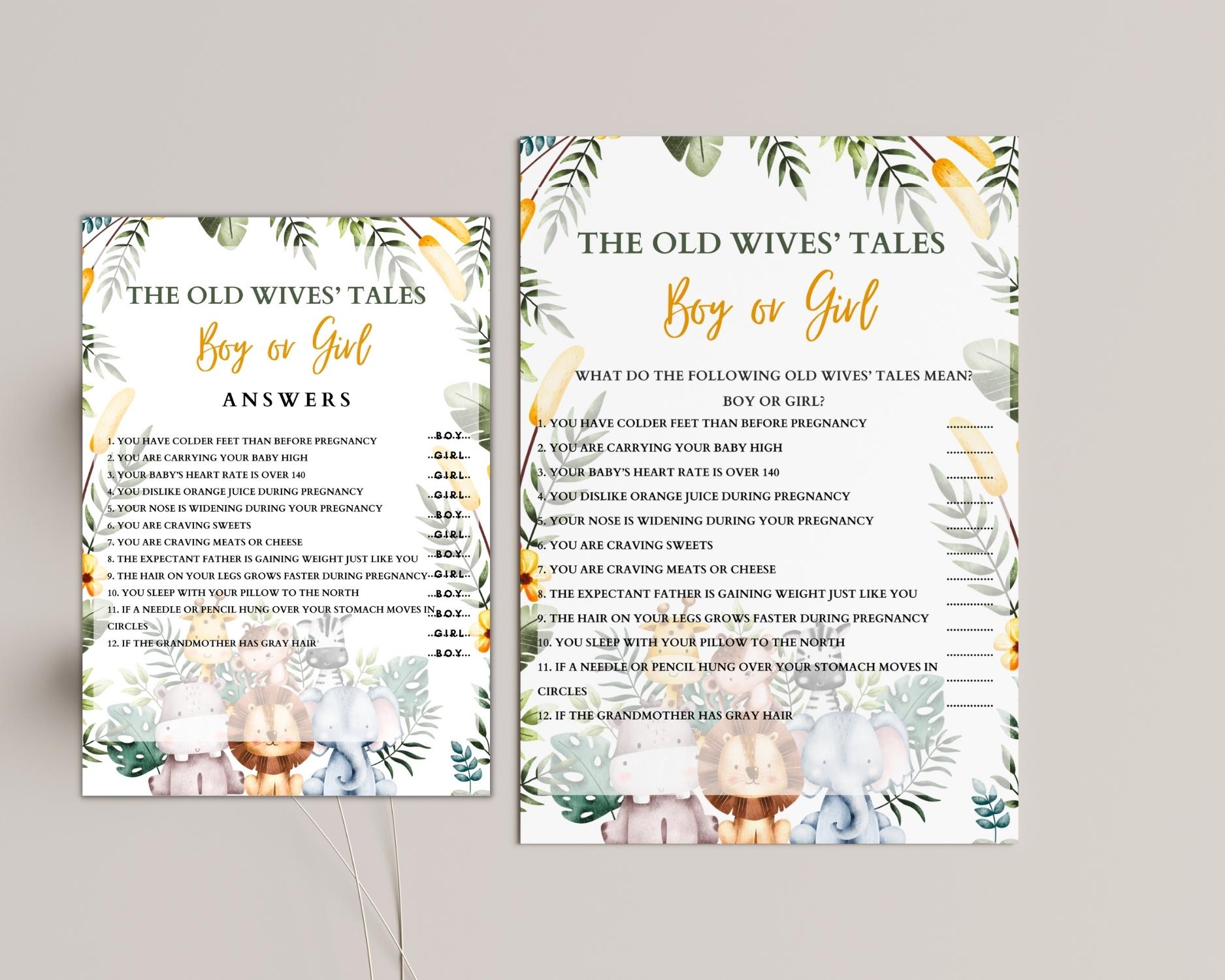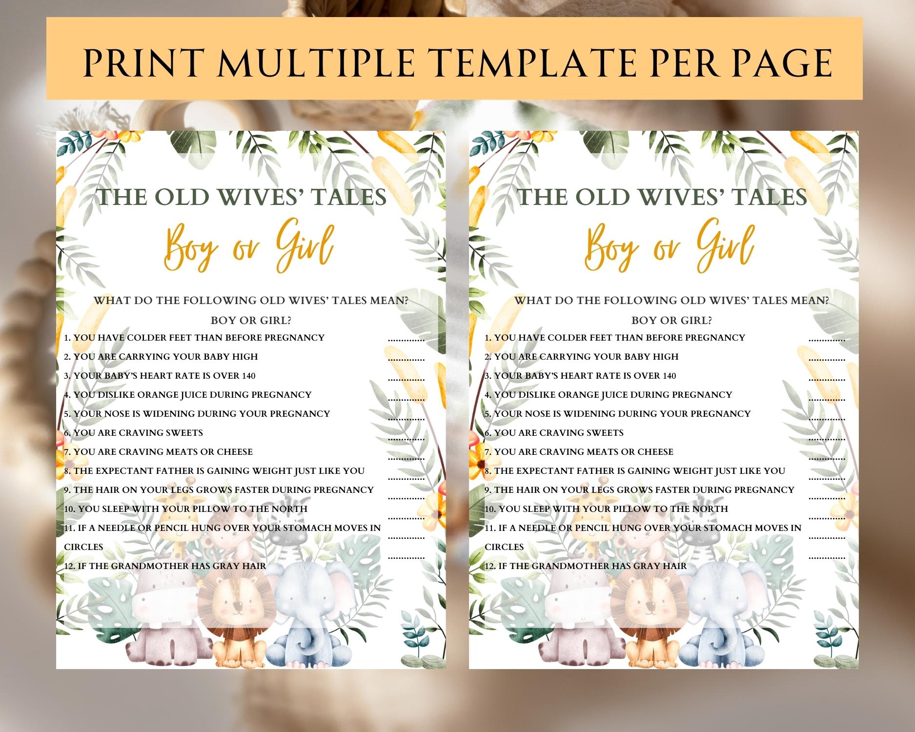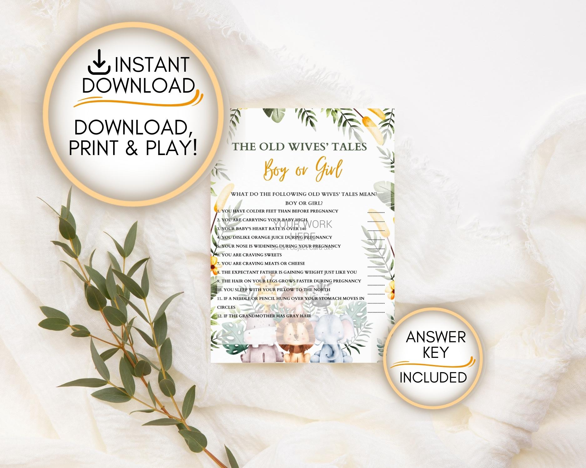 Step into the mystical world of pregnancy folklore with our ‘Old Wives’ Tales’ baby shower game! This delightful printable includes a collection of intriguing old wives’ tales related to pregnancy. Guests can test their knowledge by guessing whether each tale predicts a boy or a girl. From carrying high to craving sweets, this game is both fun and educational. Plus, you’ll receive two PDF files in different sizes, ensuring a perfect fit for your baby shower. And if you’re feeling creative, the editable Canva version allows you to customize the game to match your theme. Get ready for laughter, surprises, and a touch of tradition!