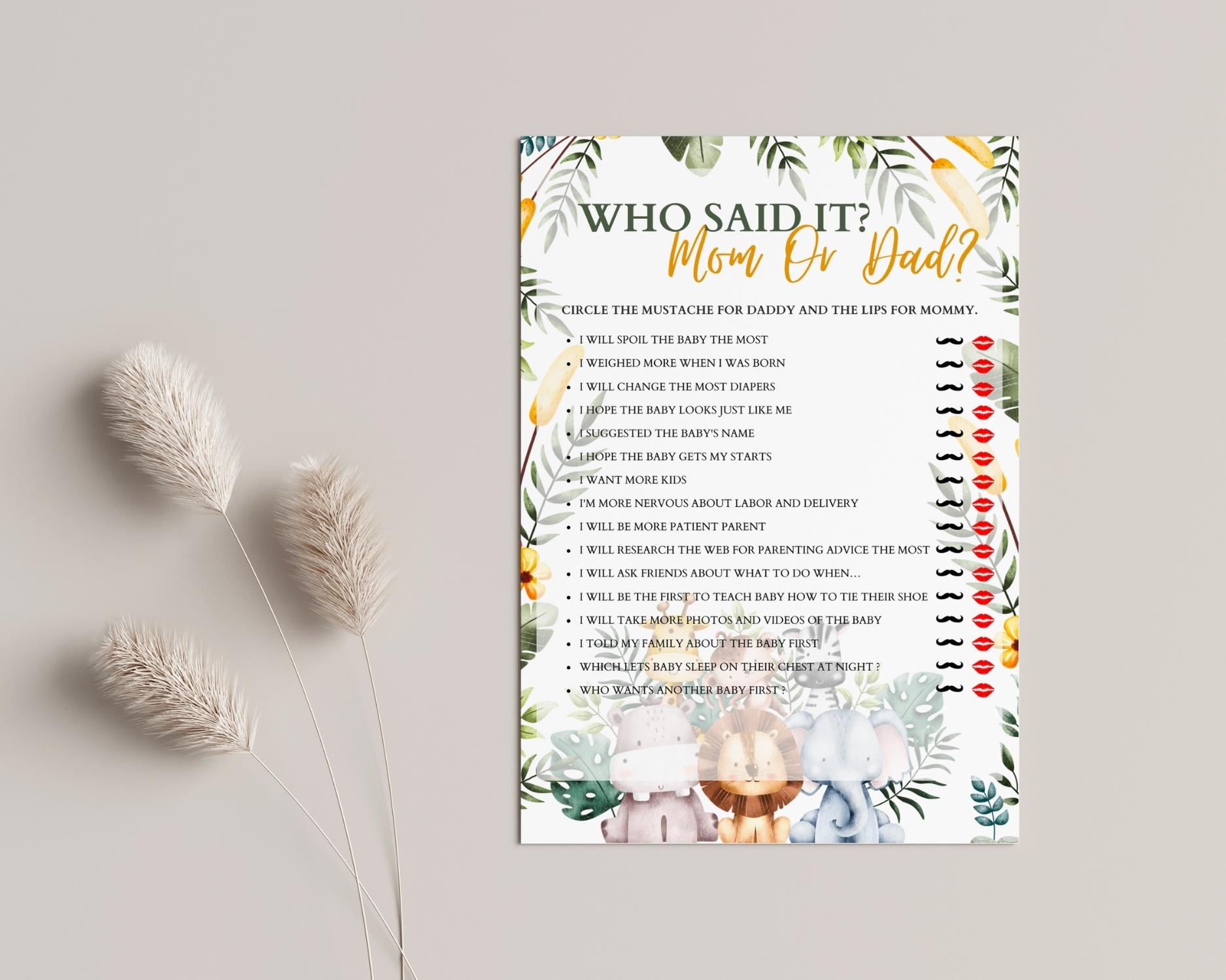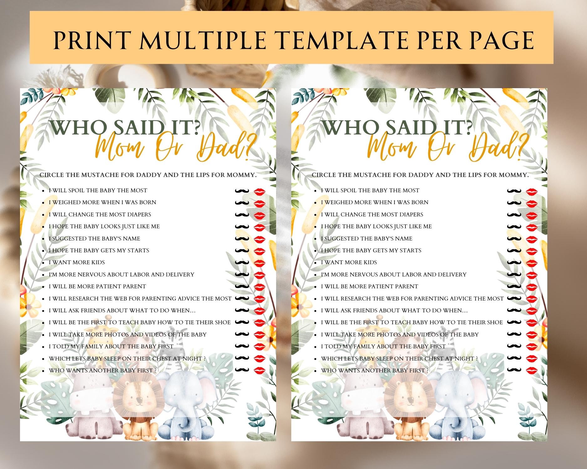 Dive into a guessing game of parental quotes with our ‘Who Said It – Mom or Dad?’ game! This fun activity tests guests’ knowledge about the soon-to-be parents by having them guess who made each statement. It’s a fantastic way to bring laughter and personal touches to your baby shower. The game is easy to customize with our editable Canva template and comes with printable PDFs in multiple sizes, ready to entertain!